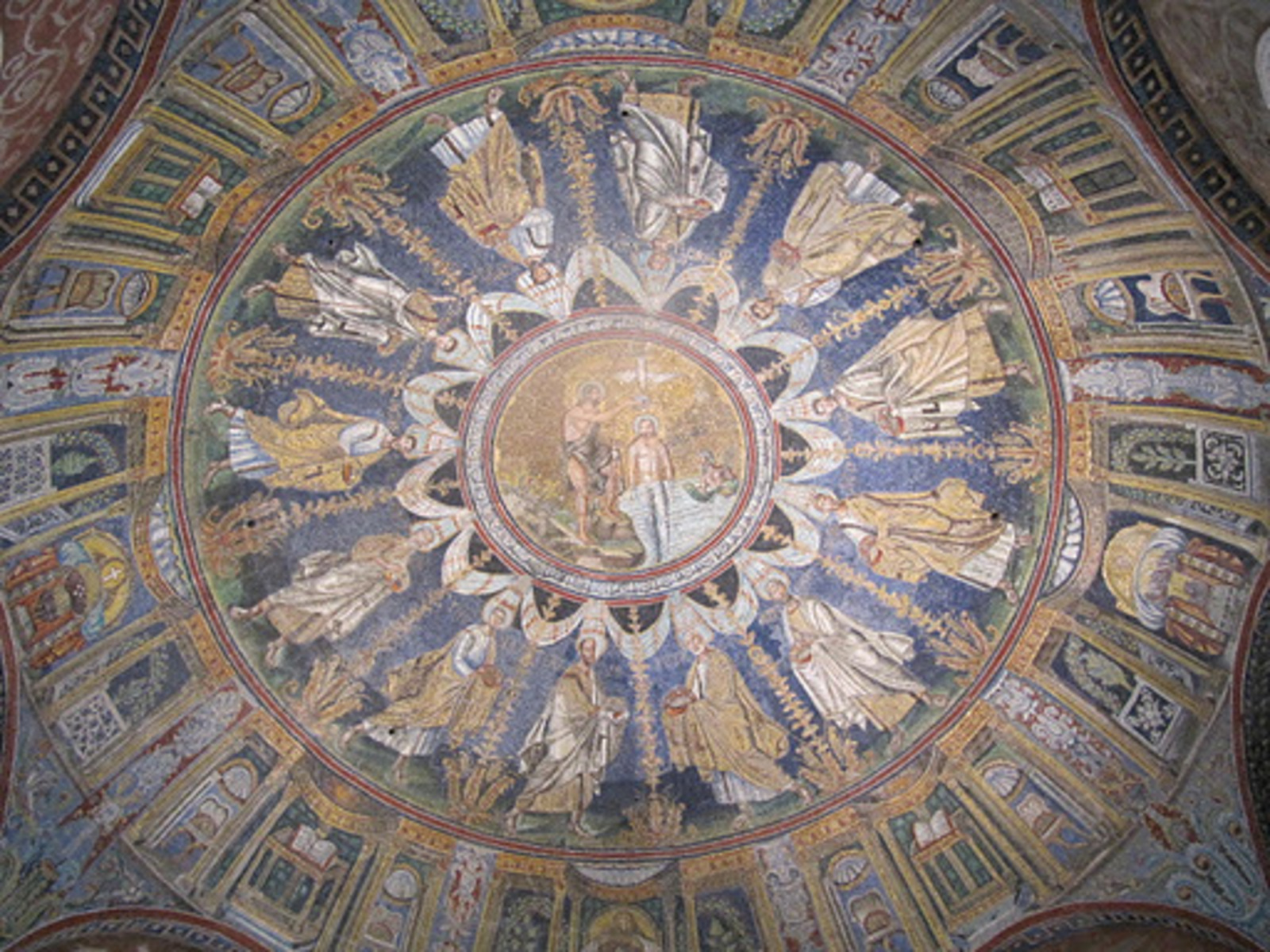 În cele din urmă, în centrul cupolei domină un mare medalion înfățișând pe Hristos scufundat până la glezne în apele cristaline ale Iordanului, alături de Ioan Botezătorul: este cel mai vechi martor al unui mozaic înfățișând botezul lui Hristos în interiorul unui monument.