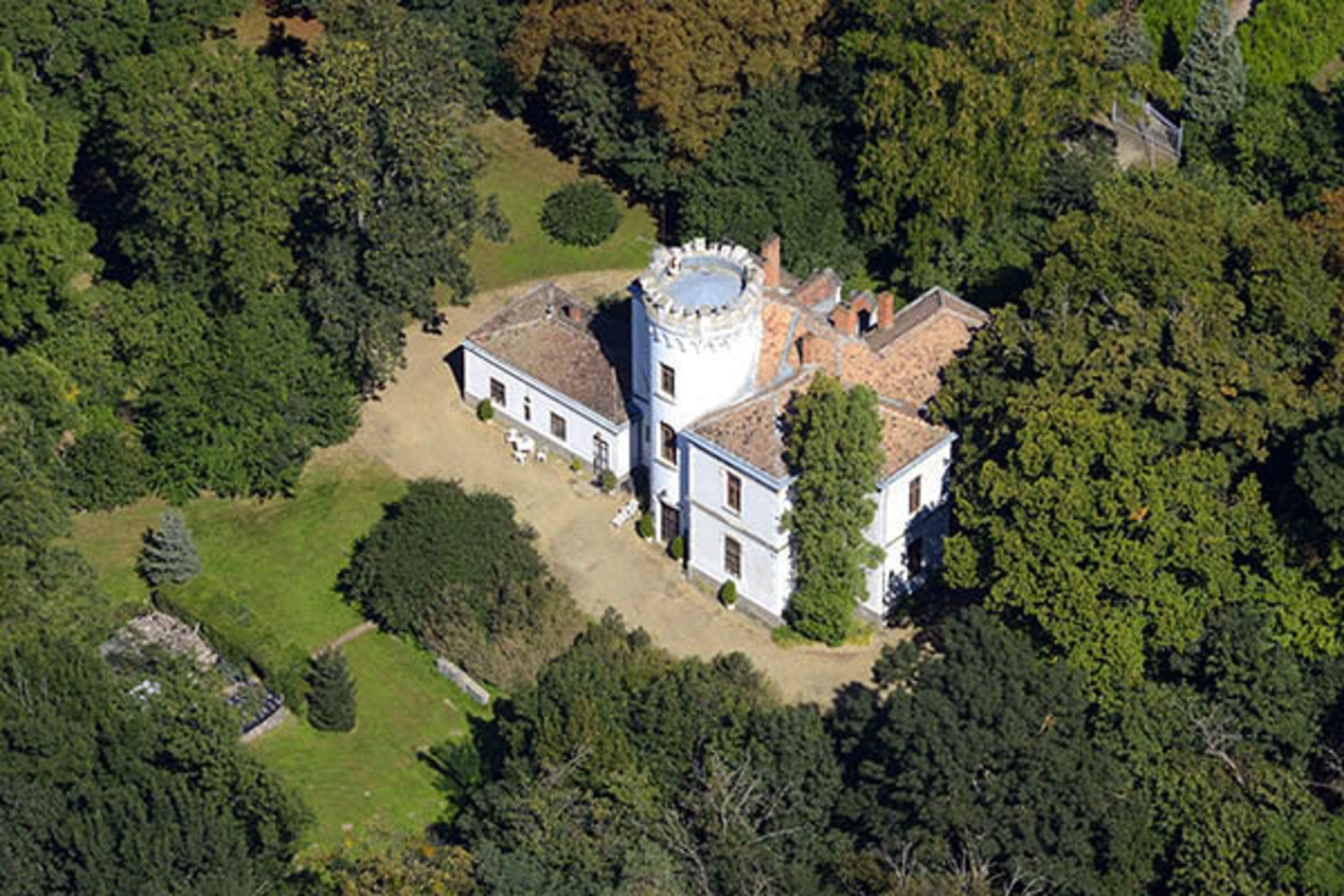 Lakások, volt Bejczy-kastély, romantikus-eklektikus, 19. sz. második fele. Kertjében romantikus-Szt. Margit-kápolna, 1880 körül.