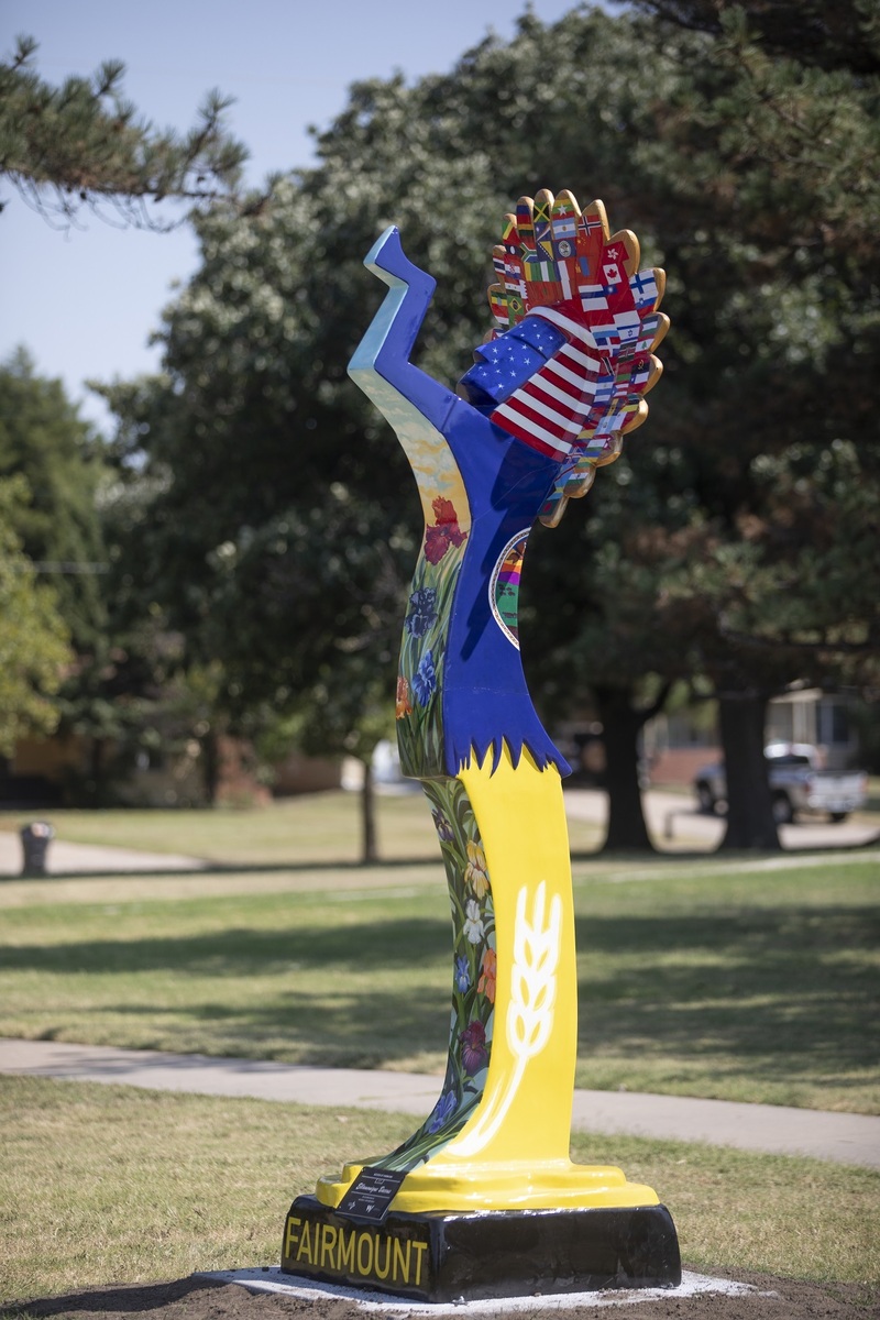 150 international flags celebrate Wichita’s 150th anniversary and represent the countries of birth and cultural identities of people living in the Fairmount community drawn by nearby Wichita State University. The 150 flags are connected by the stars and stripes of the United States flag. The red iris is at the heart because it represents rare beauty achieved by a diverse combination as do the culturally diverse residents that call Kansas home (represented by the Kansas flag). The red iris does not occur naturally and only skilled hybridists like WSU Professor and past resident Hugo Wall could cultivate it. The wheat shocks refer to the shared past, present and future of the Fairmount community and Wichita State University.