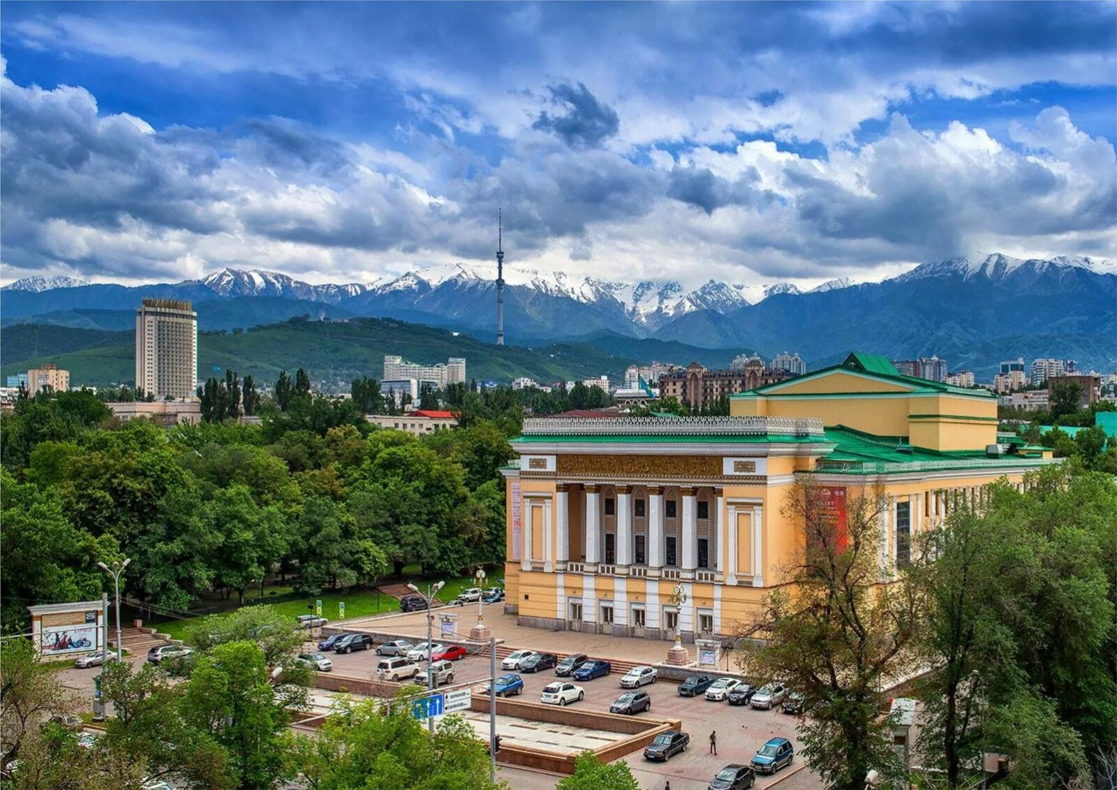 It is the oldest theater in the country. It has taken its residence in this building in 1941 (architects N. Kruglov, N. Prostakov), although its repertoire life had begun earlier in 1934. The first musical performance was "Aiman-Sholpan" as per libretto of M.O. Auezov. The "Swan Lake" of P.I. Tchaikovsky marked the beginning of the ballet company in 1938. The fate of the building was not easy. Its construction started in 1936, and a year later the unfinished building burned. Newly rebuilt, it represents the birth of the original architecture of the "national style". Natalia Sats, the well-known Director of the theatre, noted that "people who built the theatre were familiar with Italian architecture, but fell in love with Eastern ornaments, and gave a surprisingly complex chord to the building". Its monumental forms and colonnaded portico attract people’s attention. Zhambyl with a group of people is in the center of the bas-relief. Those people represent the allegory of musical creativity and fertility. There are scenes of the Kazakh heroic epics and the scenes of the period of Civil war around. The artistic ornaments on the walls, ceilings, columns and interior were made in the national style. The scene of the theater keeps memories of such luminaries of the opera and ballet of Kazakhstan as Kuliash Baiseitova, Ermek Serkebayev, Rosa Dzhamanova, Ramazan Bapov. There are squares, monuments, busts of Mukhtar Auezov and Zhambyl Zhabayev along the both sides of the building. Cosy squares, beautiful fountains and monuments create a unique atmosphere and preserve the charm of the old center of Almaty.