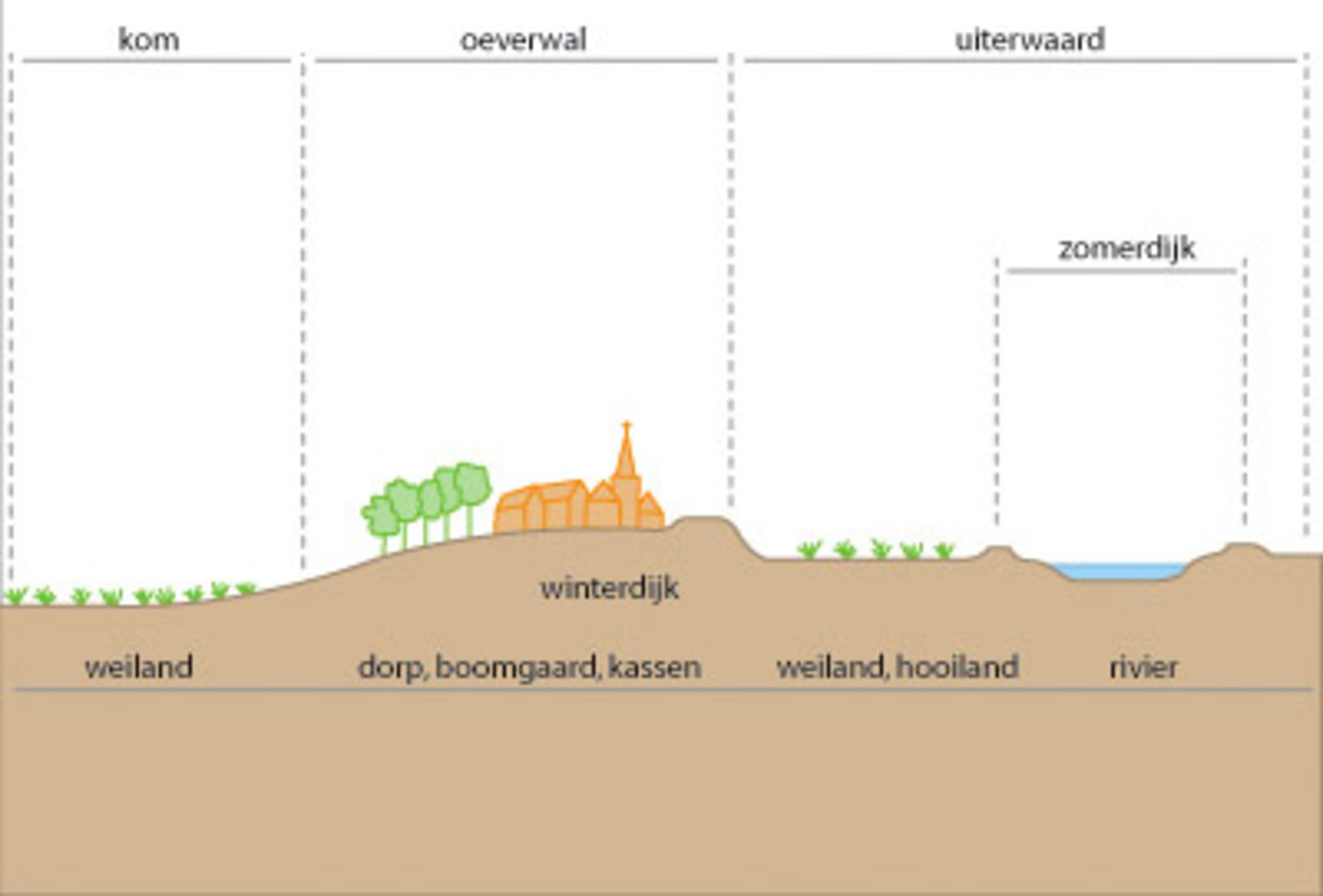 Lang voordat de mensen hier zijn gaan wonen, kronkelden er al rivieren in het gebied. De rivieren de Rijn, de Waal, de Maas en de Linge vormen het landschap. Er zijn nog geen dijken. De rivieren kronkelen vrij door het landschap en zorgen voor veel overstromingen. Daarom wonen er maar weinig mensen in het rivierengebied. Er zijn wel nederzettingen op de hooggelegen delen langs de rivier. Omdat ze daar droge voeten houden. Die hoge stroken land noemen we oeverwallen. Verder van de rivier zie je de lage delen: de kommen.