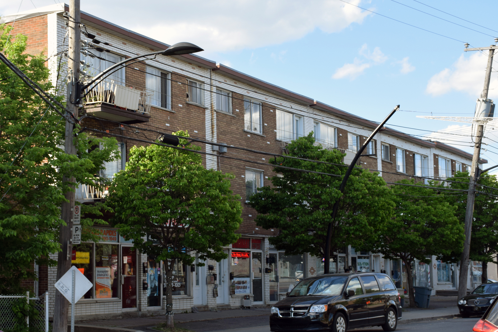 Avec l'aréna Garon et l'hôtel de ville, nous avons abordé la question des services publics. Mais les nouveaux habitants qui viennent s'installer à Montréal-Nord dans les années 50-60 ont aussi besoin d'avoir accès à des commerces. Pour ne pas perdre de place normalement destinée à du logement, on va voir émerger des immeubles à vocation mixte, tels ceux devant lesquels vous vous trouvez et qui ont été construits en 1967. Il s'agit de bâtiments résidentiels dont les rez-de-chaussée sont réservés à des magasins.