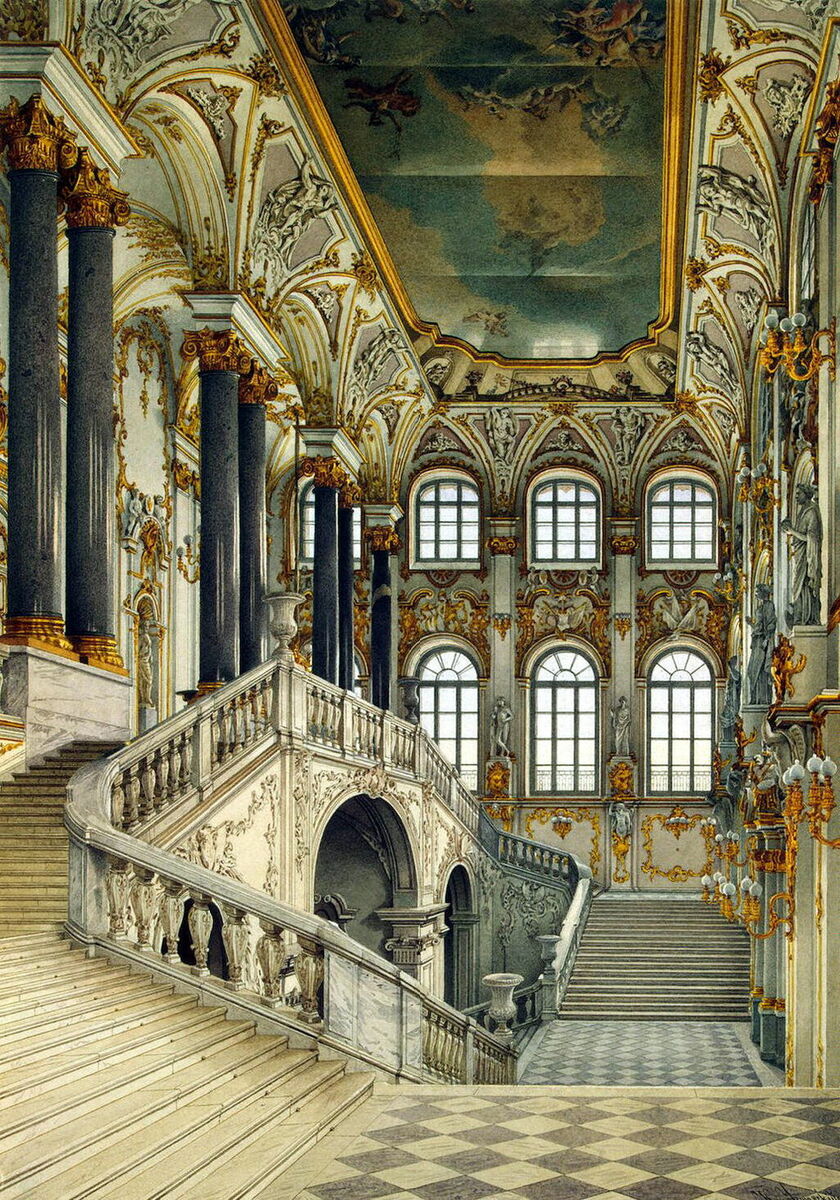 The principal or Jordan Staircase of the Winter Palace, St Petersburg is so called because on the Feast of the Epiphany the Tsar descended this imperial staircase in state for the ceremony of the "Blessing of the Waters" of the Neva River, a celebration of Christ's baptism in the Jordan River. The staircase is one the few parts of the palace retaining the original 18th-century style. The massive grey granite columns, however, were added in the mid 19th century.