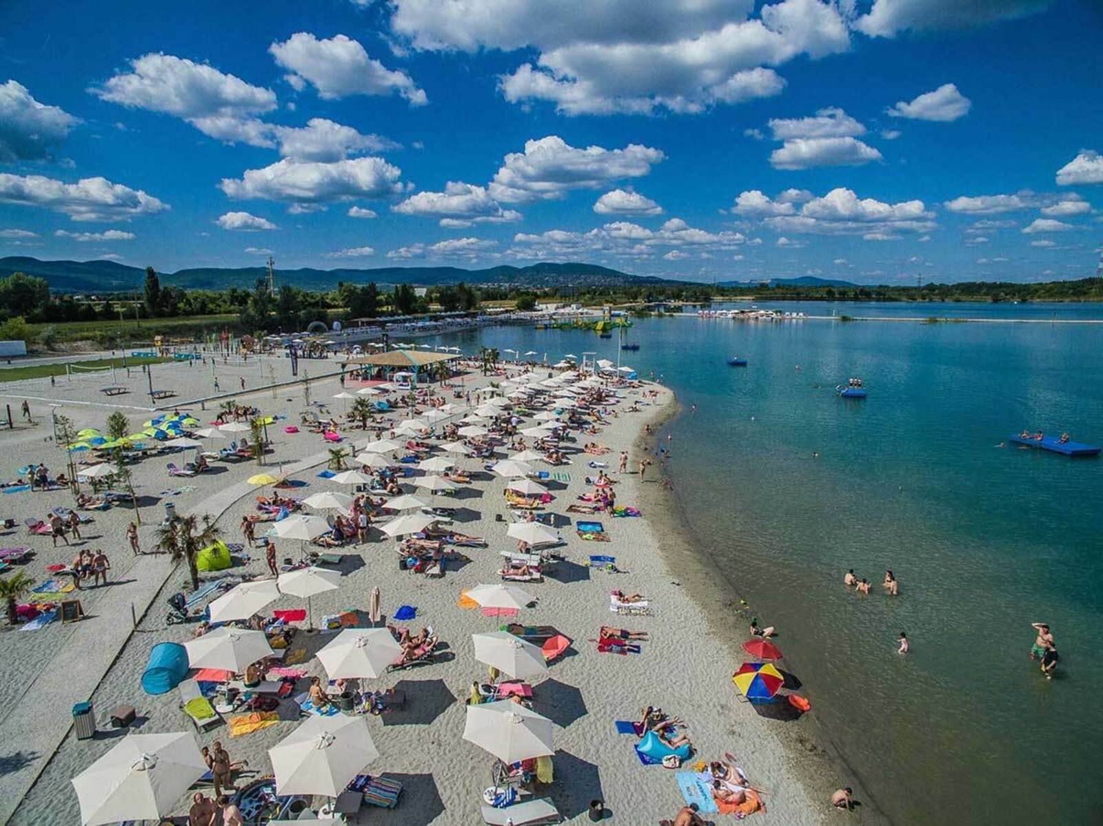 一个基督教的水,一个天然的阳光花园 卢帕简直是不可错过的。不仅因为它离布达佩斯只有几分钟的路程(LupaBus可以在大约半小时内把你从Nyugati带到这里),而且还因为它是一个真正的天堂般的体验,只需要普通的海滩门票的价格。清澈的绿松石水,棕榈树环绕的海滩,海滩俱乐部,美食,钓鱼,专业的旱地和水上海滩运动,所有这些都在一个地方,但又互不干扰。你是一个被动的度假者吗?把自己扔进丝滑的白沙里。租一张日光浴床或双人天幕床,点一杯冰镇的美味玫瑰酒。从防波堤上把你的脚伸进水里,或者从上面的桑拿塔上看着脚下的躺椅。你是一个活跃的度假者吗?和你的伙伴们一起试试奥林匹克认证的沙滩排球场,或者在看台上观看职业女孩的比赛。在铁球场上锻炼身体,跳上皮划艇或在湖中央用SUP划出。飞翔,潜水,尝试一切。你有孩子吗?和孩子们一起在浅水区的儿童海滩上安顿下来。在水上探险公园或蹦床上让他们疲惫不堪。如果他们饿了,就在几步之遥的美食街上,有各种菜单可供选择。