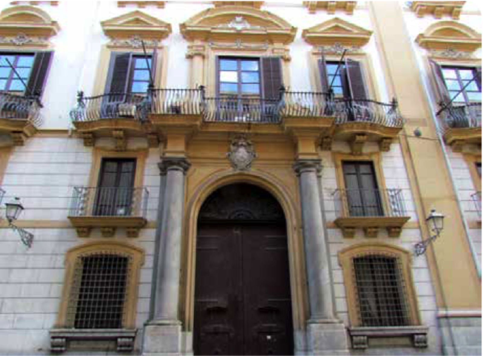 Sapete in cosa consiste la particolarità di questo edificio? Esso si sviluppa introno a un articolato impianto a tre cortili disposti a L con tre accessi distinti, due su via Maqueda e uno su via del Bosco. Dal portale di sinistra, su via Maqueda, potrete accedere allo scalone d’onore, da cui avrete modo di ammirare la particolare visuale prospettica dei due cortili in sequenza, intervallati da un portico colonnato. L’ingresso da via del Bosco immette nel cortile dello scalone in cui è collocata una fontana di marmo incorniciata da una composizione pittorica a trompe l’oeil.