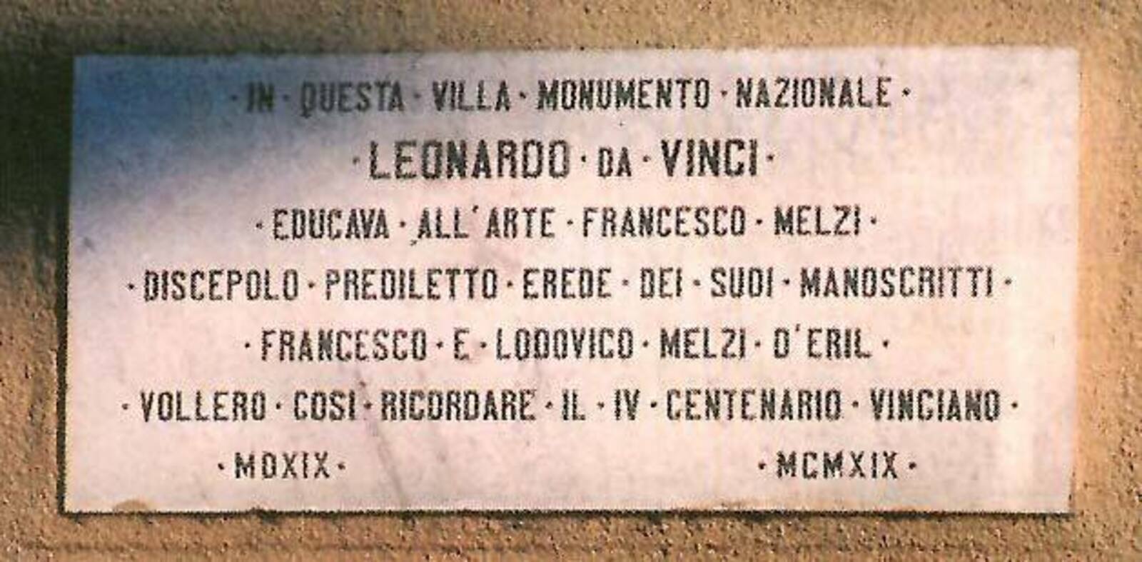 De frente a la puerta de entrada de la Villa Melzi, se colocaron dos losas con representados dos pies que recuerdan su presencia en Vaprio. Al lado de la puerta, en la pared, encontramos una placa de piedra en memoria del IV centenario Da Vinci.