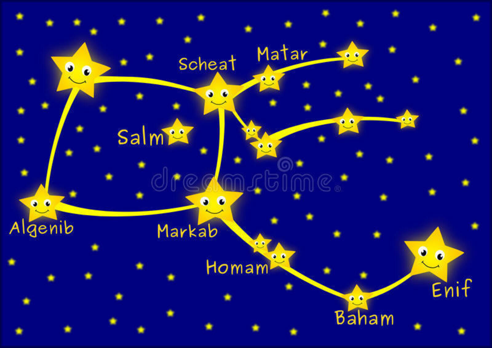 Las estrellas más brillantes de Pegaso, Markard (α Pegasi), Sheat (β Pegasi), de la segunda magnitud, y Algenib (γ Pegasi), de la 3ª magnitud, forman el triángulo del ala del caballo. Las cuerpo del caballo está constituido por un cuadrilátero formado por Markab, λ Pegasi, ι Pegasi y ξ Pegasi. Las patas anteriores de Pegaso están compuestas por dos estrellas de la 4ª magnitud que no tienen designación de Bayer, tienen números de Flamsteed: 1 Pegasi y 9 Pegasi. Enif (ε Pegasi) (de la 3ª magnitud) y Baham (θ Pegasi) forman las patas de atrás. ρ Pegasi y σ Pegasi aparecen en la cola, pero son poco brillantes (quinta magnitud). Matar (η Pegasi) (de 3ª magnitud) y π Pegasi (el hocico) forman la cabeza de Pegaso. Sadalbari (μ Pegasi) está situada en la base de su cuello. Las tres estrellas más brillantes de Pegaso forman, con Sirrah (α Andromedae), un asterismo llamado el cuadrado de Pegaso. Sirrah era antes asignado a Pegaso con la designación δ Pegasi.