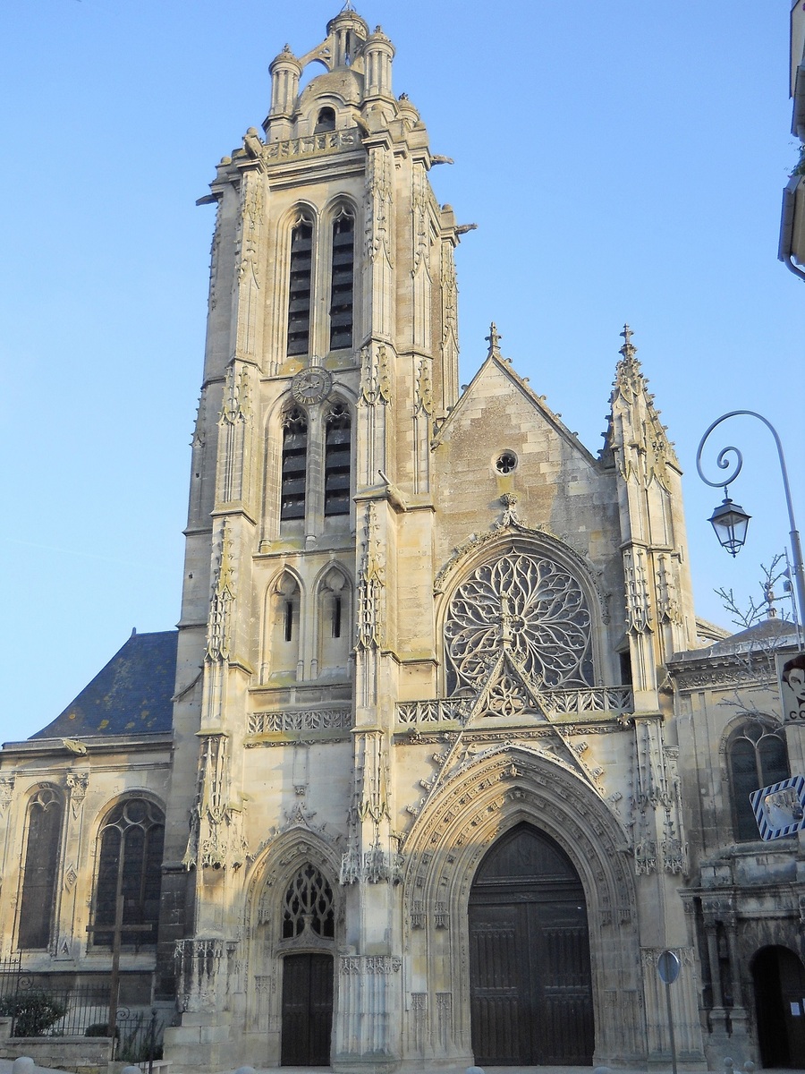 After having glimpsed it in the distance, finally, here is the Saint-Maclou Cathedral. This young cathedral, Pontoise did not actually become a bishopric until 1966, is a very old church. To understand its architecture, you must bear in mind that its construction spans from the 12th to the 16th centuries. The first building, undoubtedly constructed from 1140 to 1160, is Roman and corresponds to the current chevet and the transept. At the end of the 15th century. the church was deeply modified. The nave was elongated, the main facade was rebuilt, and the bell tower was built in a beautiful, flamboyant gothic style.