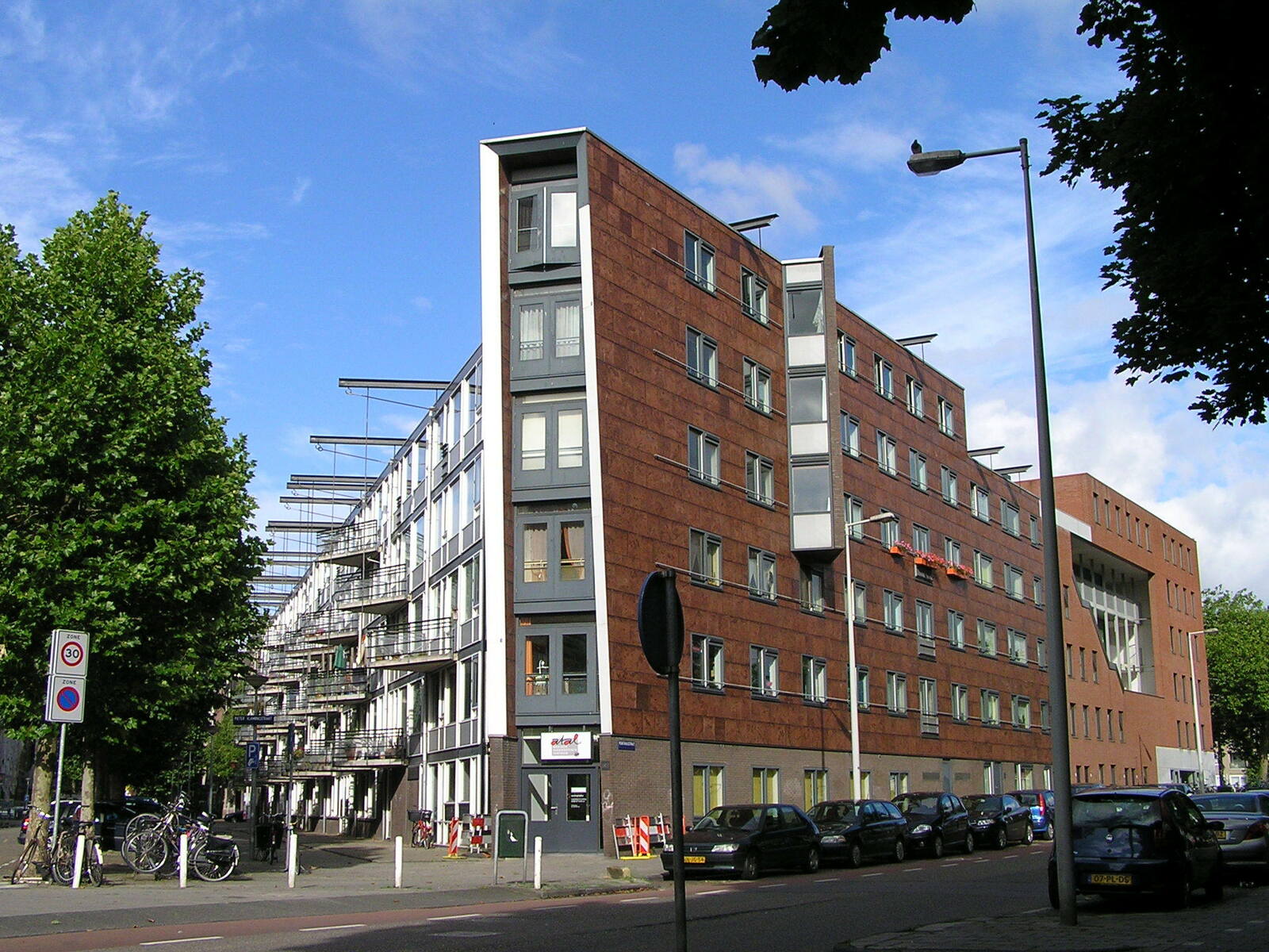 You see that narrow, steep stairway? Precisely on the corner? That connects and, at the same time, distinguishes the closed section on the main road from the more open part containing experimental dwellings along the less busy street. The convergence of a busy thoroughfare and a quiet residential street at a sharp corner was the point of departure of Van der Pol’s design for a housing block.