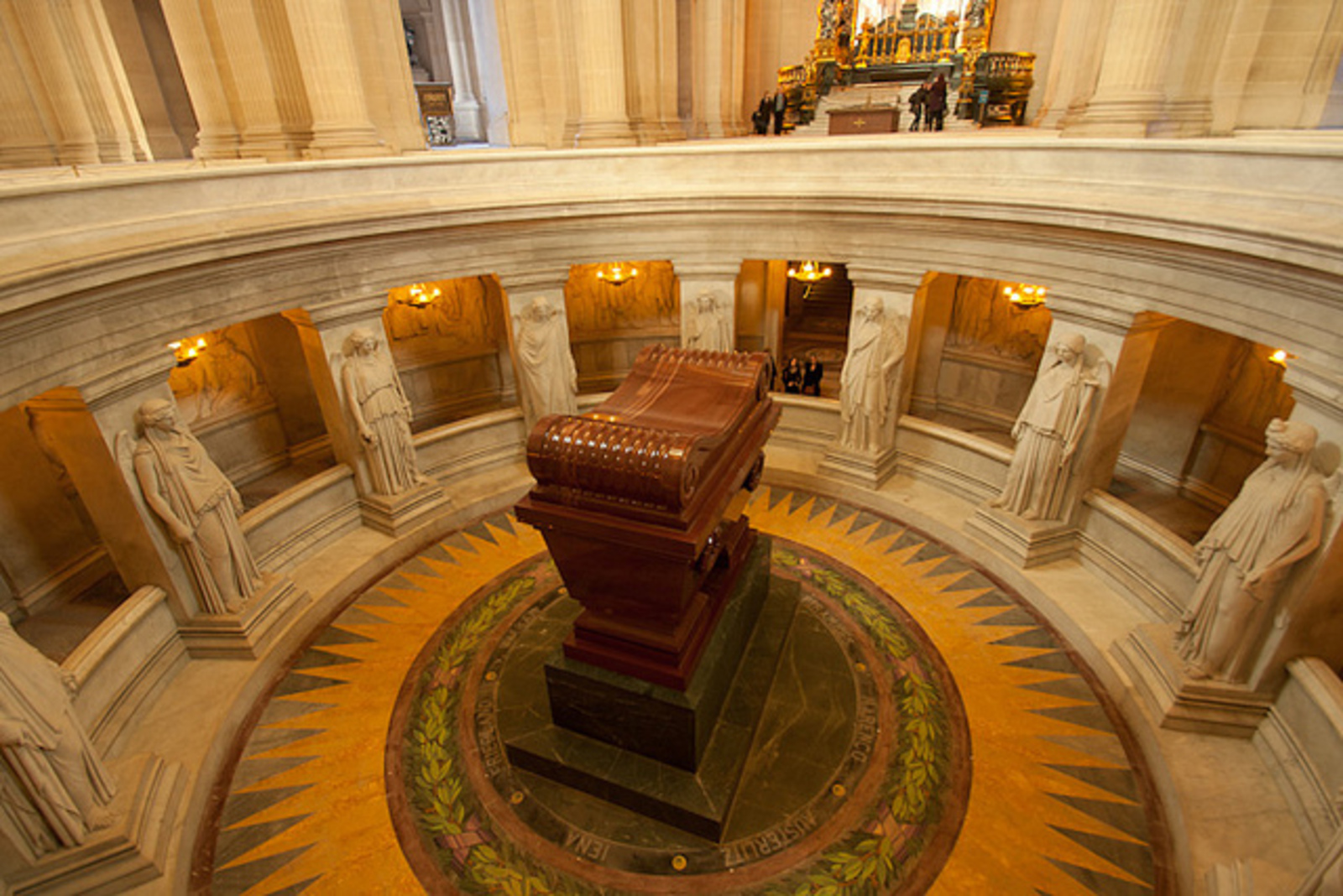 在中央位置是拿破仑的石棺,这是一座由红色石英岩制成的宏伟纪念碑,置于来自孚日山脉的绿色花岗岩基座上。石棺周围环绕着一圈金色的青铜月桂冠,象征着拿破仑的胜利。