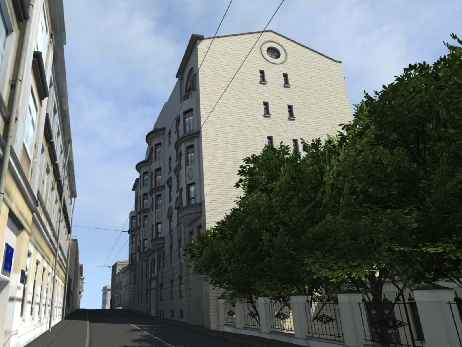 Стена фасада, выходящая на Малый Знаменский переулок, разделена застекленными полукруглыми выступами- эркерами и арками.