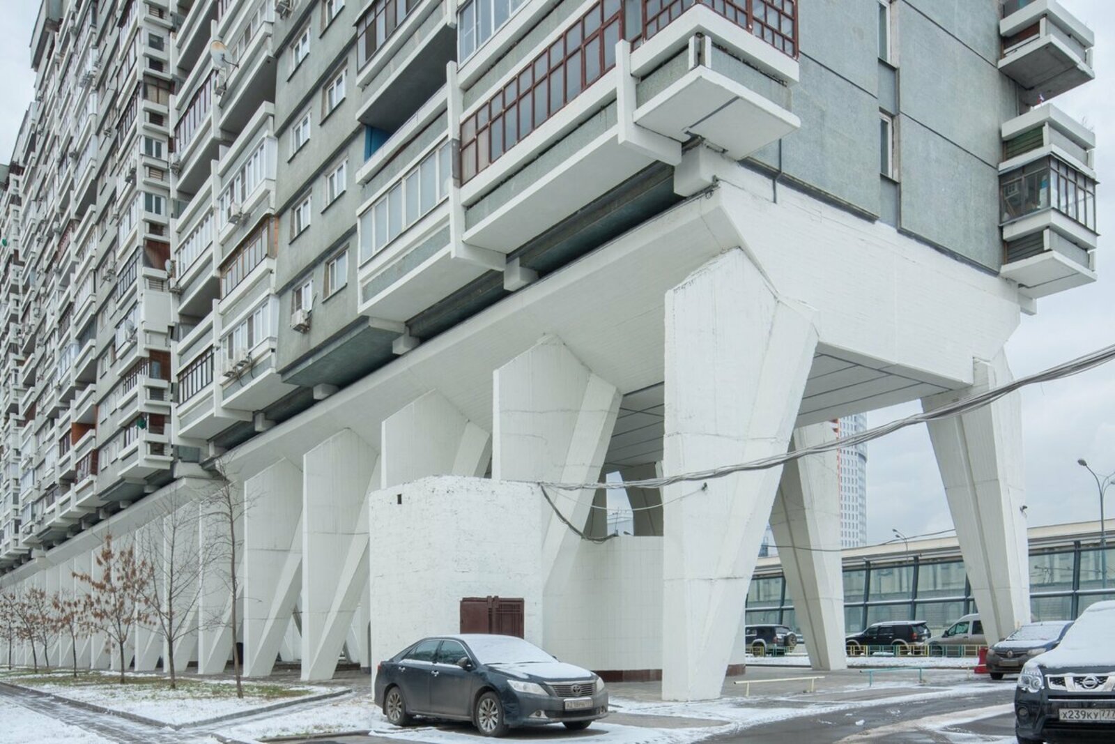 Важно, что архитектор все-таки добивается использования монолитного железобетона — в то время это было очень сложно сделать при возведении жилого дома. Но, поскольку дом строился на хозрасчете, завод, видимо, выделил на это средства. Из монолитного железобетона отливают и эти самые ножки, придавая им таким образом очень эффектную форму, и вот эти башни отдельные, эллиптические лестницы внутри. Меерсон, скорее всего, вдохновлялся мировым движением брутализма, где возникла идея обнаженного железобетона, когда оставляли фактуру опалубки. По рабочим швам и переходам из одной опалубки в другую видно, как все монтировалось. То же самое мы видим и на лестничной клетке, на наружной ее части — вот этот бруталистский эффект чего-то грубого, весомого, зримого как противопоставление чрезмерной легкости, невесомости, абстрактности модернистской архитектуры. Архитектура становится более ощутимой.