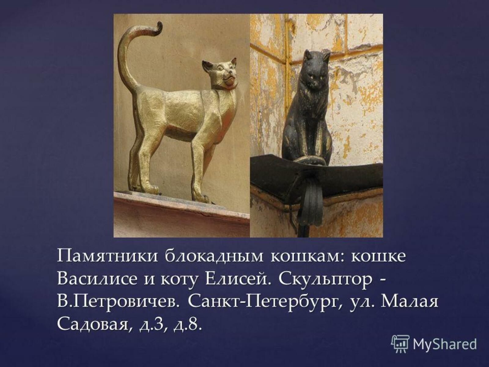 В Санкт – Петербурге на Малой Садовой улице есть памятник блокадным котам Ленинграда: бронзовый кот Елисей примостился на уровне второго этажа Елисеевского магазина, а напротив него – кошка Василиса, она поселилась на карнизе дома N3.