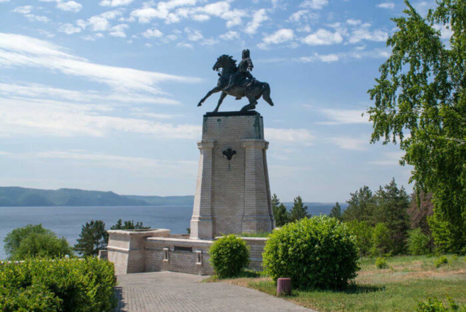 Спуск к памятнику представляет собой лестницу с фонарями в виде стилизованных крепостных башенок, завершающуюся облицованным брусчаткой пандусом. В 2000 году в ходе первого Международного театрального фестиваля в Тольятти у подножия памятника было высажено 30 саженцев вишни — фестиваль открывался пьесой А. П. Чехова «Вишнёвый сад», вишнёвая ветвь была и символом фестиваля. Деревья у памятника высаживали народные артисты СССР Элина Быстрицкая, Владимир Андреев, народные артисты России Евгений Князев, Наталья и Глеб Дроздовы, а также представители театров Москвы, Санкт-Петербурга, Омска, Ярославля и США, и Германии[2].