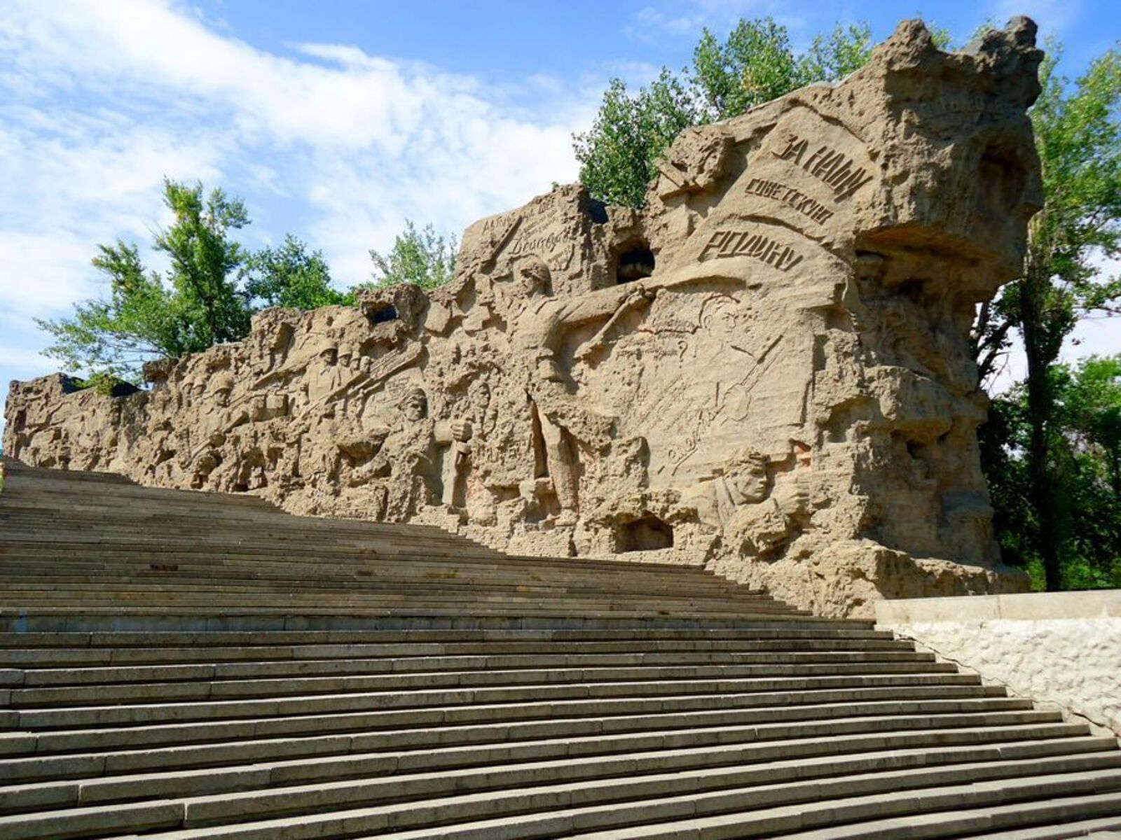Стены-руины – отдельный эпизод из жизни воюющего Сталинграда. Эти две огромные каменные стены окружают зрителя с обеих сторон, нагнетая атмосферу военного Сталинграда. Стены-руины на Мамаевом кургане выполнены в форме горельефа: фигуры солдат, орудий и танков, вырубленные в стенах. Левая часть стен покрыта многочисленным количеством ярких фраз: «За Волгой для нас земли нет!», «Ни шагу назад!», «Мы клянемся», «Назад не пойдем!». Реалистично передано выражение лиц солдат. На вершине стены возвышается солдат с винтовкой – это известный снайпер Василий Зайцев. Правая часть стен-руин на Мамаевом кургане посвящена боевым сражениям под Сталинградом. Танки, разрушенные дома, напряженные лица солдат, стиснувших в руках гранаты и пулеметы. В дополнение ко всему увиденному из спрятанных в стенах-руинах на Мамаевом кургане репродукторов звучат пулеметные выстрелы, военные песни, гул истребителей и знаменитый голос Советского Союза диктора Левитана, передающий сводки новостей с поля боя.