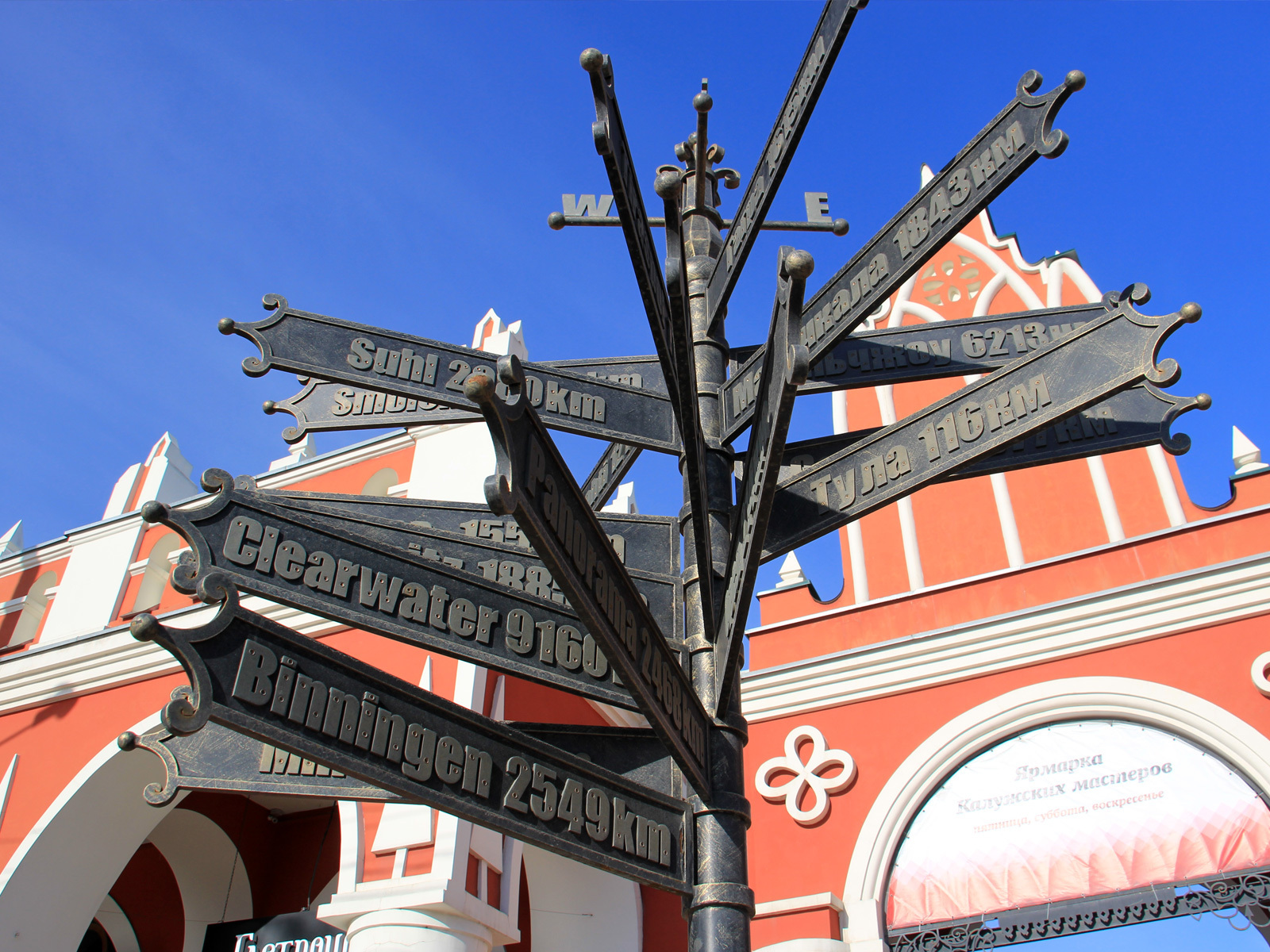 Что из себя представляет столб городов-побратимов? Это всего лишь вариация компаса, где, вместо магнитной стрелки, столб уже сориентирован и зафиксирован по сторонам света. Именно об этом и говорят нам указатели север-юг-запад-восток, установленные на вершине столба. И стрелки с названиями городов выставлены точно по азимуту, указывая направление каждого конкретного города: Орел - 214 км, Тула - 116 км, Смоленск - 350 км… Стоп - это же расстояния до городов по автомобильным дорогам! Но ориентирование по компасу основано на «полярной системе координат» и направление по азимуту измеряется по прямой. Значит, на столбе указано направление, оно же азимут, по которому расположен город, и расстояние по кривой? Тогда правильнее указывать стрелки не по направлению города, а на дорогу, по которой к нему нужно ехать.