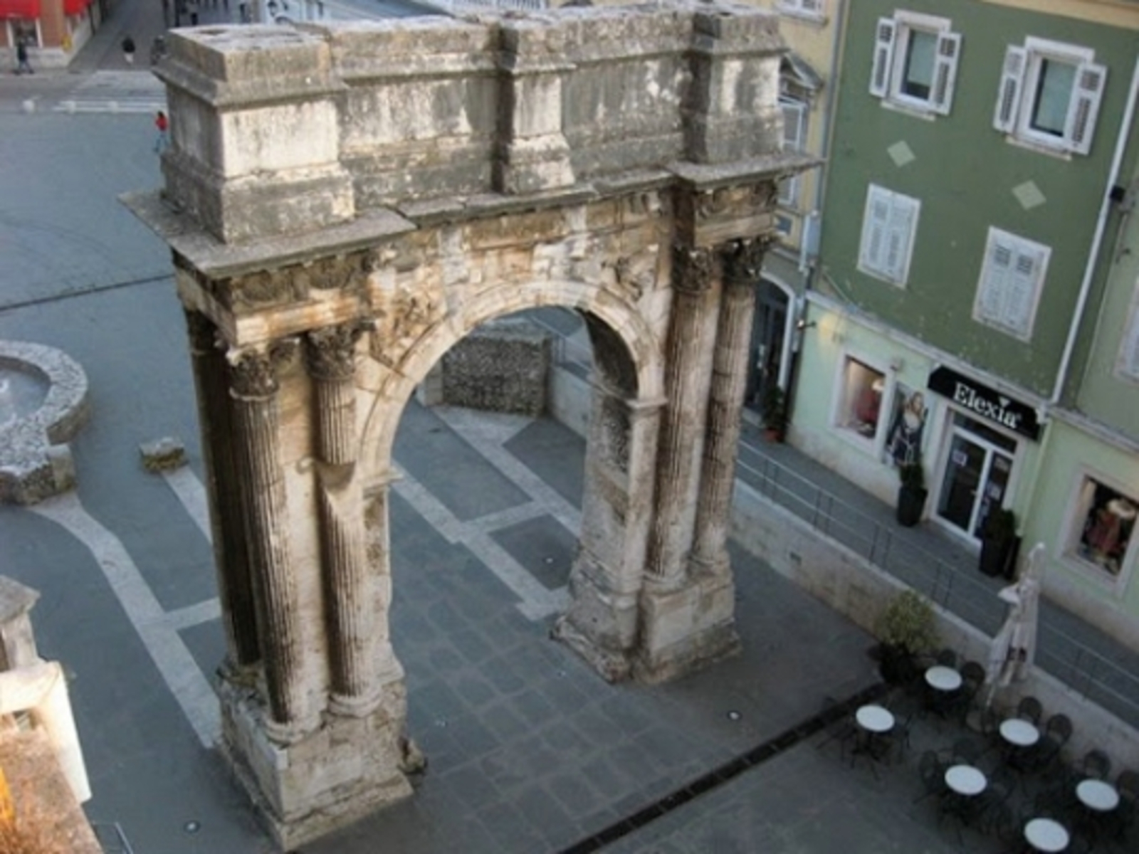 Уникальна она тем, что, если обычно триумфальные арки возводились в честь императоров, именно эта возведена в честь гражданских лиц, трёх членов семьи Сергиус, которые занимали важные посты в Пуле.