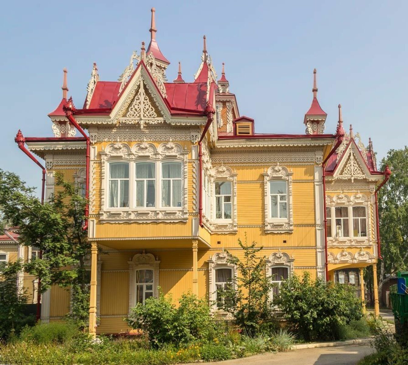 Простой контур здания обогащают пристроенные эркеры с двух сторон. Дом отличается лаконизмом целого и богатством отдельных декоративных элементов.