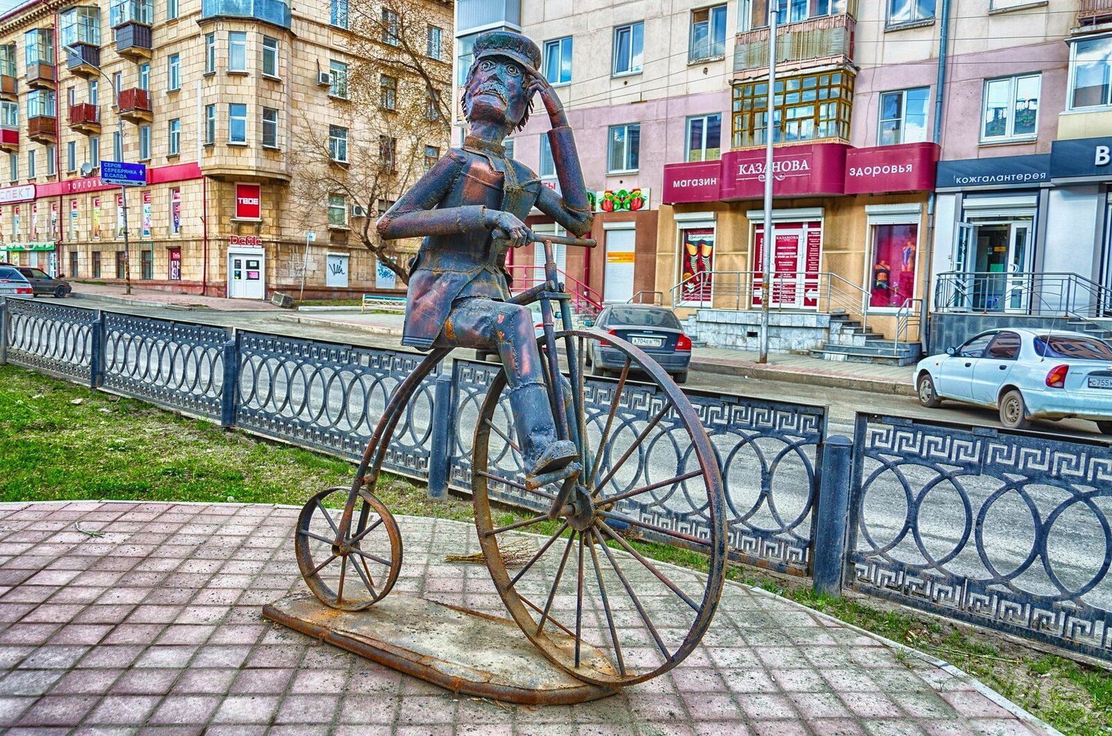 Мы пришли с вами к памятнику «Велосипед Артамонова». Посмотрите на него внимательно: бородатый дяденька на странном велосипеде, где одно колесо чуть ли не размером с самого водителя велосипеда, а второе меньше в несколько раз. Этот дяденька с бородой и есть Ефим Артамонов.