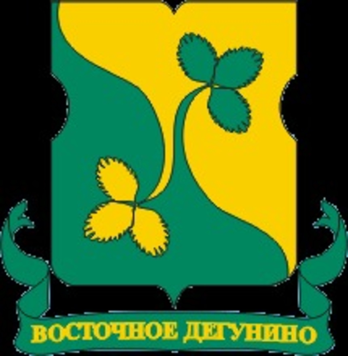 Герб района Восточное Дегунино представляет собой щит московской формы, разделенный на две части. Левое поле – золотое, правое – зеленое. Каждое поле заходит в противоположное в виде расположенных по диагонали листьев земляники.