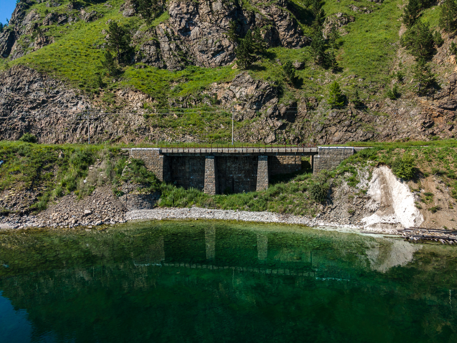 Перед нами железобетонный тридцатиметровый виадук второго пути, он пятый по счету на Кругобайкалке. По первому пути виадука нет.