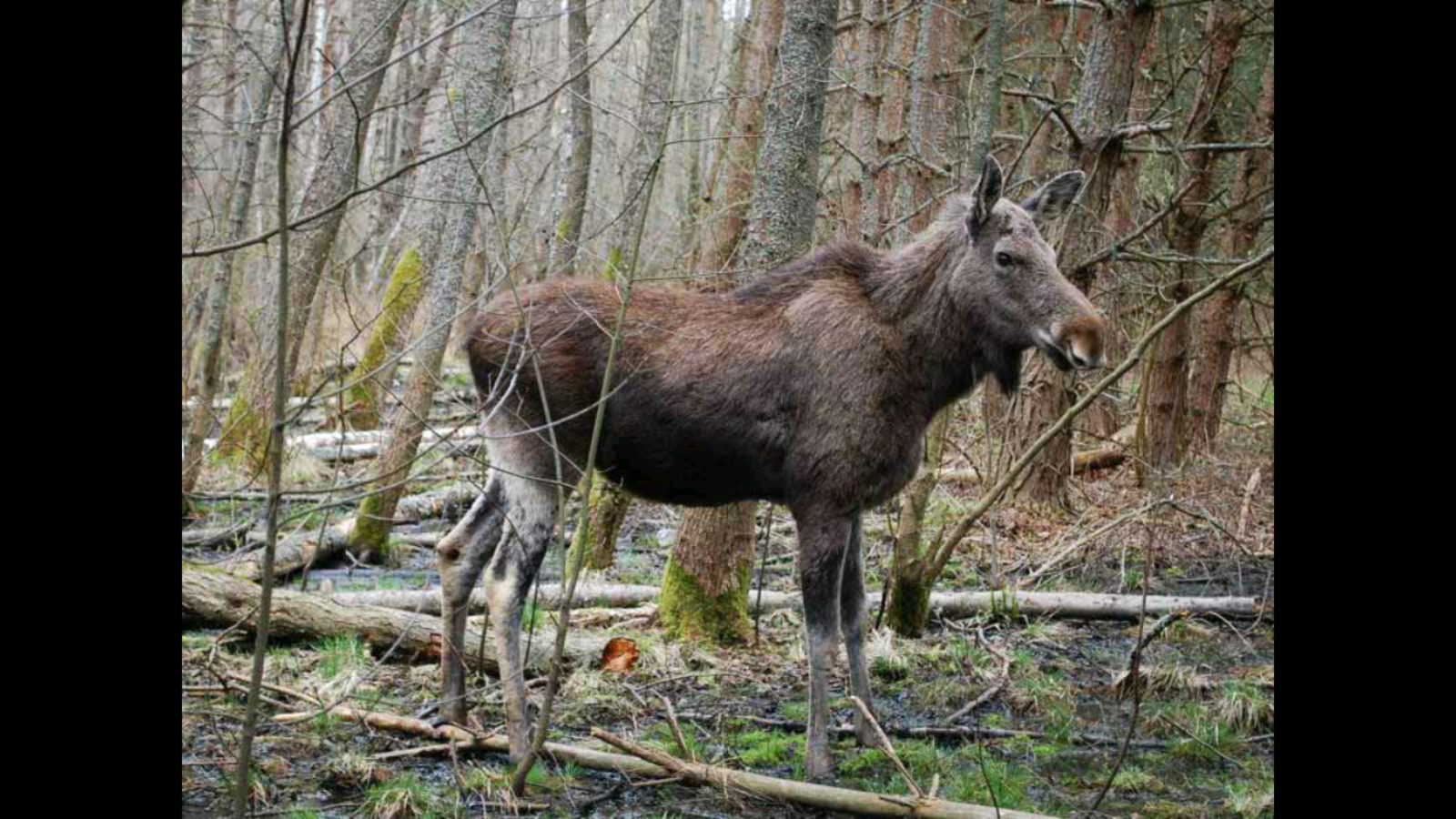 Лось - самый крупный из оленей. Вес его достигает до 500 килограмм. Его легко узнать по длинным мощным ногам, горбоносой морде. Рога взрослых самцов обычно состоят из короткого ствола и широкой лопаты с отростками. В настоящее время численность в парке составляет 9 особей.